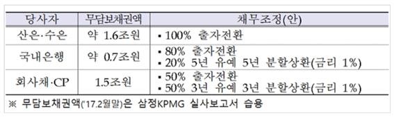 산은과 수은은 무담보채권액 16000억원을 100% 출자 전환한다. 국내 은행 역시 채권액 7000억원 중 80%를 출자 전환한다. 20% 5년 유예하고 5년간 금리 1% 조건으로 분할 상환한다. 회사채·기업어음(CP) 50% 출자전환하고 나머지는 3년 유예, 금리 1% 조건으로 3년 분할 상환한다.