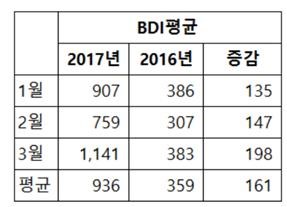 3개월간 BDI는 평균은 936포인트로, 전년동기간의 359포인트에 비해 161%나 급등했다. 특히 3월 BDI월평균은 1,141포인트로 1,100포인트대를 기록했으며, 전년동월에 비해서도 200% 가까이 급상승했다.